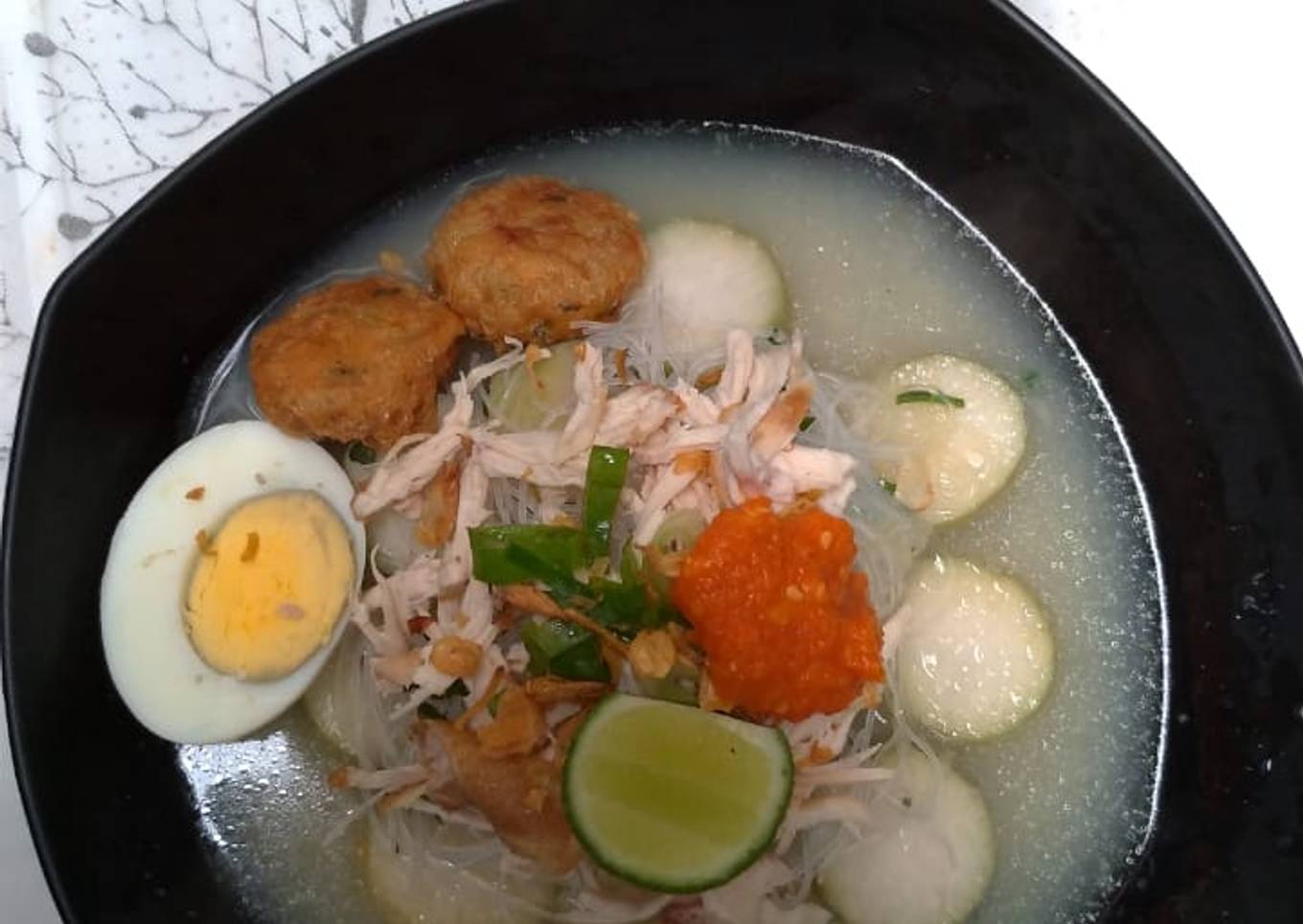 - Pelengkap, soon, perkedel, ayam suwir, telur rebus, sambal rebus